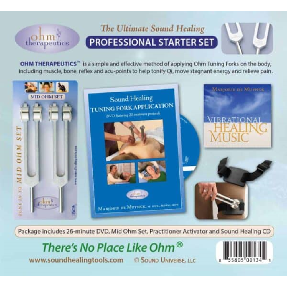 De Professional Starter Set bevat alles wat u nodig heeft om Sound Healing in uw behandelingen op te nemen. Vibrerende genezing met behulp van twee Mid Ohm stemvorken verbetert veel behandelingsmodaliteiten en is zeer effectief wanneer het toegepast wordt op de acupunctuurpunten en het meridiaansysteem van het lichaam.